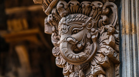 architectural detail close-up of intricate carvings and designs on ancient temple, created with generative ai