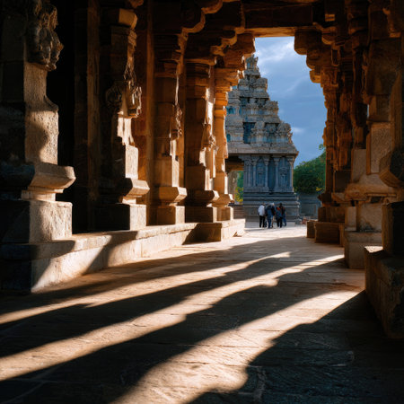 This image captures the stunning architecture of an ancient temple, showcasing intricate pillars and a sunlit pathway. Visitors explore this serene and sacred site, surrounded by rich history and cultural significance.