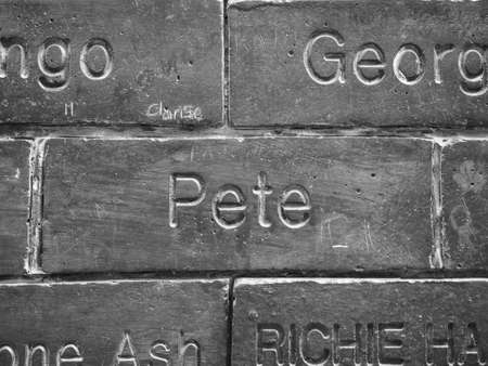 LIVERPOOL, UK - CIRCA JUNE 2016: The Wall of Fame at the Cavern Pub opposite the Cavern Club where The Beatles played. Detail of Pete Best tile. in black and white