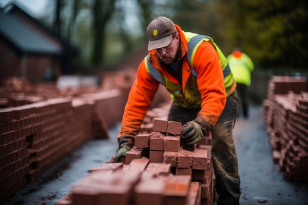 Skilled construction worker laying red brick wall with precision using trowel and brick