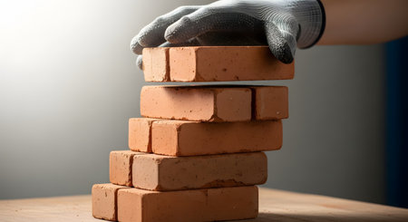 A close-up of a hand wearing a grey work glove, stacking red bricks one on top of the other. The bricks are being built into a small tower, representing construction, building, growth, and foundation.