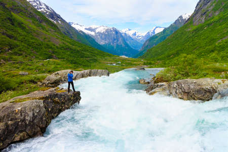 Adventure hiking man admiring Boyabreen Glacier in Fjaerland area, Sogndal Municipality in Sogn og Fjordane county, Norway. Tourist visiting norwegian nature landscape.
