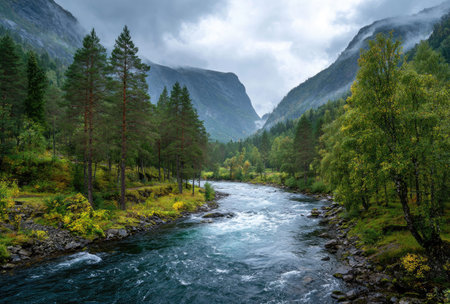 A river carves its way through a verdant valley, framed by towering mountains under a cloudy sky. The scene showcases a natural landscape with shades of green and blue, textures of water and rock. It could be suitable for environmental, travel, or editorial projects.