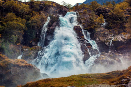 Scenic Alpine Nature. Beautiful Waterfall and the Glacial River. Norway, Europe.