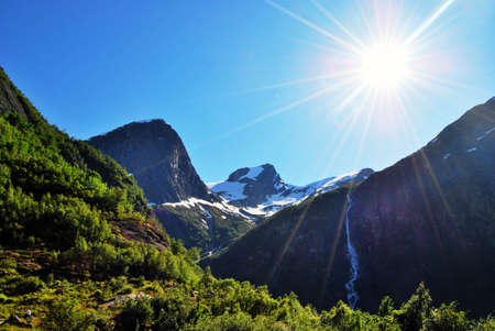 pictured is a sunny Norwegian day in the mountains, near a waterfall.