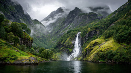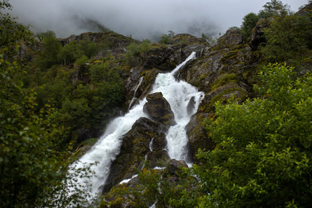 Waterfall in the mountains in foggy morning, Norway. Summer landscape