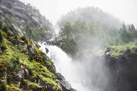 Kjoasfossen Waterfall, Norway cascades down rugged rocks surrounded by lush greenery, creating mist and frothy whitewater. Steep, rocky powerful Norwegian waterfall.