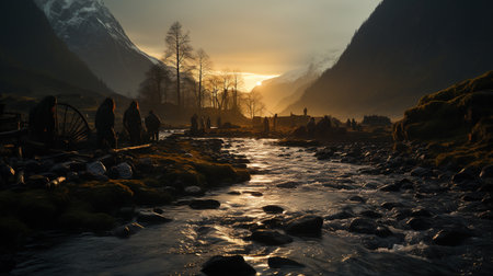 Picturesque mountain lake scene with golden sunset glow