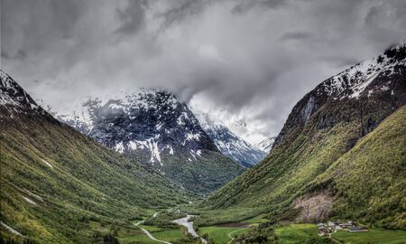 Travel to Norway, the river flows through the plain between the mountains, small houses on the banks.