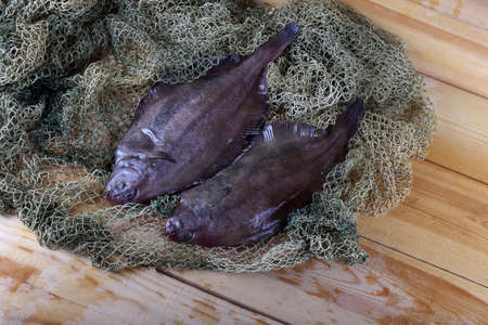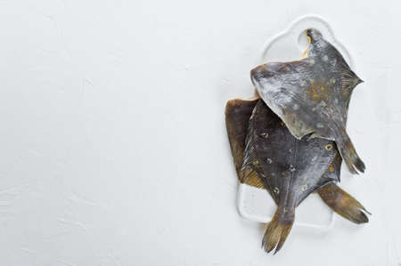 Flounder raw fish on a dark background.Copy space. selective focus.