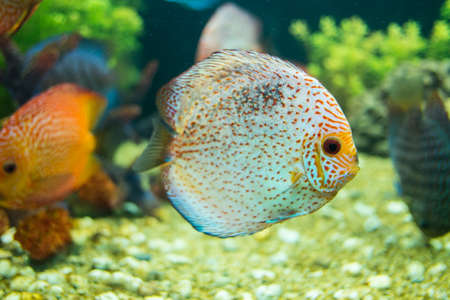 Discus, colorful cichlids in the aquarium, freshwater fish that lives in the Amazon basin. Colored, bright fish in the aquarium. A variety of marine fish