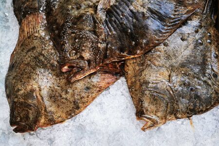 Seafood - Flounder and oysters lie on the counter on ice in store. Copy space. Selective focus.