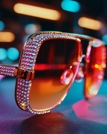 Detailed image of glittery rhinestone-decorated sunglasses placed on a surface with glowing bokeh lights in the background, exuding futuristic Y2K vibes.