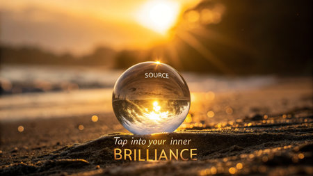 A clear crystal sphere on a sandy beach reflects a vibrant sunrise, showcasing inner brilliance and the power of light, perfect for inspiring personal growth and spiritual connection.