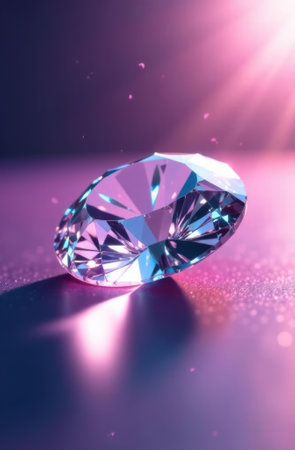 Large, sparkling diamond sits on purple glitter background with light rays shining down in vertical composition, perfect for luxury, wealth, and jewelry concepts