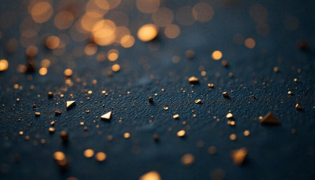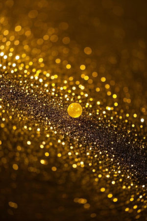 Soft, out of focus bokeh lights in golden yellow and blue tones are scattered across a dark, textured glitter background, with a bright lens flare adding a highlight.