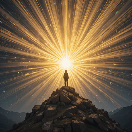 A solitary figure stands on a rocky peak, gazing at a breathtaking sunburst that radiates from behind the mountain range. The sun's rays spread out in a magnificent display of light and energy, illuminating the landscape and creating a sense of awe and inspiration. The scene captures the essence of triumph, solitude, and the beauty of nature.