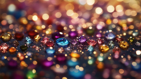 Close-up view of a collection of colorful gems sparkling on a surface, creating a rich texture enhanced by beautiful bokeh lights in the background.