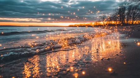 A photograph of the beach at sunset, with glowing sparkles on the water and sand. The sky is cloudy, but there is still some sunlight shining through. In front of you, you can see waves crashing onto the shore, creating small splashes that catch the light from above. There is also an ocean in the distance. It feels peaceful and serene, as if it could be the end point for your journey or something beautiful to look back upon after being on foot all day. --chaos 30 --ar 16:9 --v 6.1 Job ID: 4fd310d1-a12c-4fd7-ace0-8bce53ea8941