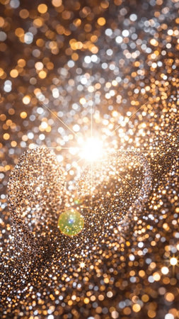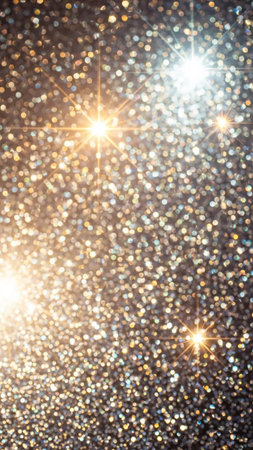 A background filled with shimmering glitter, featuring bright starbursts of light and a soft bokeh effect in warm gold and cool silver tones.
