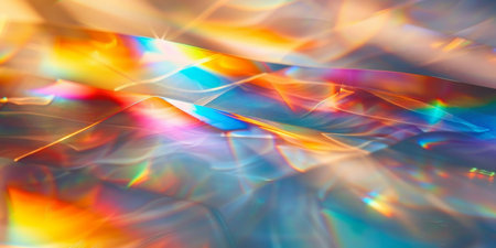 Vibrant light refractions creating a rainbow effect on a glossy surface with a bokeh background.