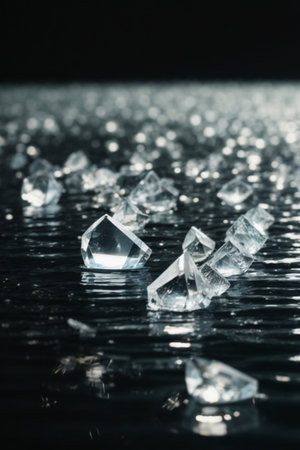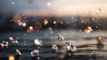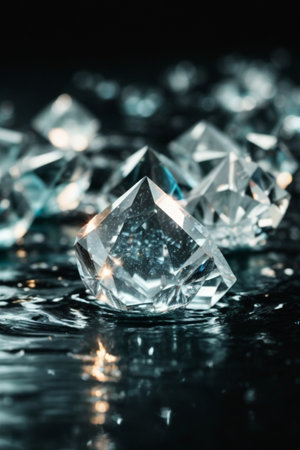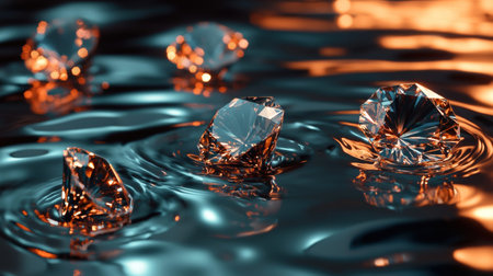 Captivating image showcasing a mesmerizing display of multifaceted diamonds floating on a captivating liquid surface