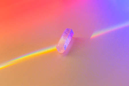 Healing chakra crystal with colorful light on beige background. Meditation, reiki and spiritual healing concept
