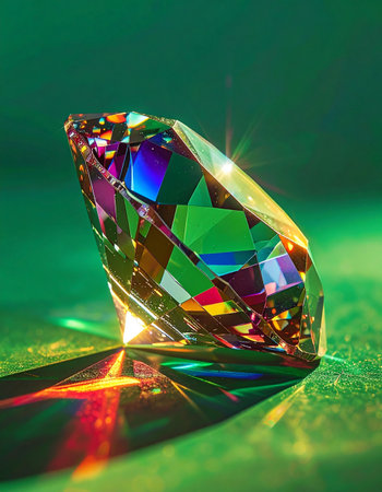 A magnificent, expertly cut gemstone rests on a rich green surface, capturing and refracting light into a dazzling display of rainbow colors. Its brilliant facets create a stunning prismatic effect, casting a vibrant, colorful shadow that speaks of luxury, value, and hidden magic.