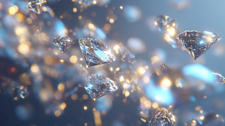 A mesmerizing composition of glimmering diamonds floating amidst a soft, dreamlike background, showcasing radiant reflections and delicate bokeh effects.