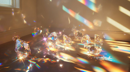 This image showcases glimmering crystal gems that emit luminous reflections against a dark background, ideal for elegant decor or fashion illustrations.
