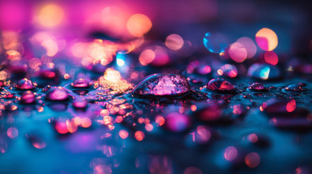 Vibrant water droplets rest on a surface, reflecting colorful lights in the background. This macro image captures beauty and artistry in texture and depth.