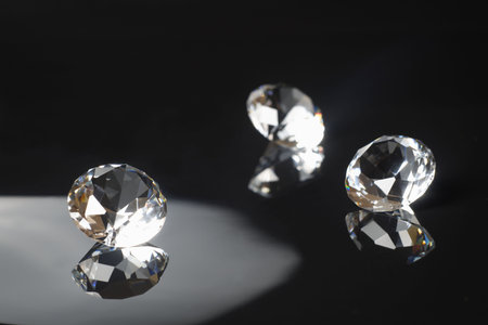 Three excellent pure diamonds with reflection on black mirror background close up view selective focus. Jewelry diamonds sale, invitation, action, discount banner, poster, card template