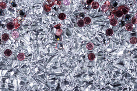 background of crumpled glossy metallic foil and rhinestones closeup