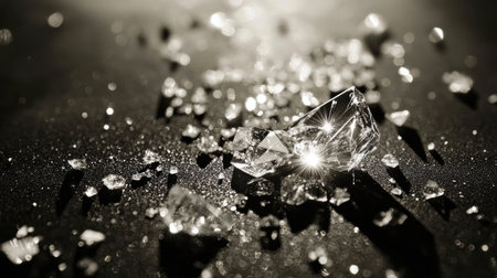 Fragments of crystal are scattered, catching light and creating intricate reflections on a dark surface.