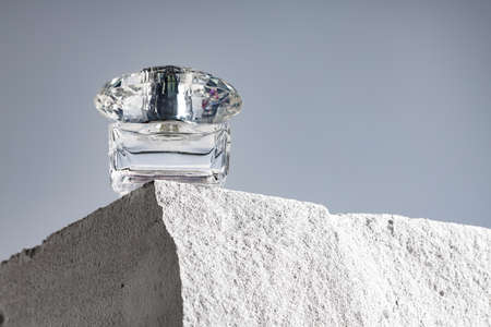 Transparent fragrance bottle on gray .cinder block