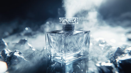 Luxury glass perfume bottle on dark background. Copy space for text, blank bottle