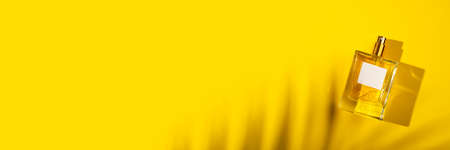 Transparent bottle of perfume with label on a yellow background. Fragrance presentation with daylight. Trending concept in natural materials with beautiful shadow. Womens essence.