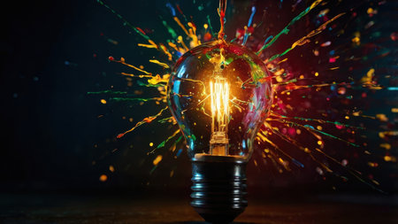 Bulb with colorful splashes on dark background. Creative concept.