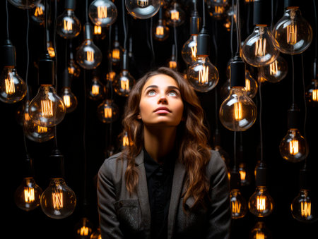 Image of woman looking at the light bulbs hanging over her, idea concept. Generative AI