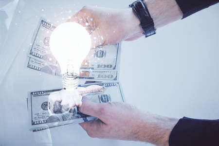 Multi exposure of bulb drawing hologram and USA dollars bills and man hands. Business Idea concept.