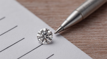 A stunning round cut diamond glistens on white paper next to a silver ballpoint pen, captured on a wooden surface, perfect for conveying luxury and elegance in visual storytelling.