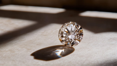 A stunning round diamond sits gracefully on a marble surface, illuminated by soft natural light, casting intricate shadows that enhance its brilliance.