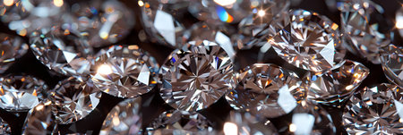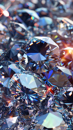 A close-up view of polished diamonds, revealing their intricate facets and sparkling brilliance. The light reflects off the surfaces, creating a dazzling array of colors and patterns. The image captures the beauty and allure of these precious gemstones.