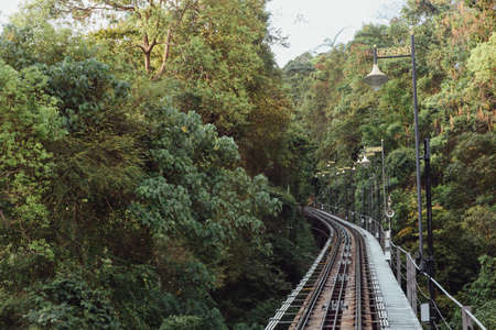 Railway among green trees that lead to the top of Penang Hill at George Town. Penang, Malaysia.