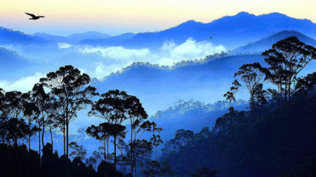Serene landscape of misty mountains with a dense forest of trees in silhouette. The mountains are various shades of blue, creating a tranquil atmosphere. A bird is visible in flight, adding to the peaceful imagery.