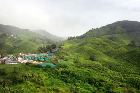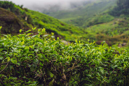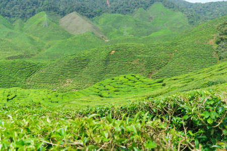 Tea plantations Cameron Valley. Green hills in the highlands of Malaysia. Tea production. Green bushes of young tea
