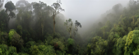 Aerial view of a rainforest tree tops with fog banner. AI generated content