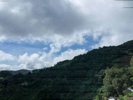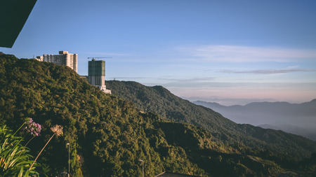 Cloudy sky, cityscape and mountain with green that viewed from Penang Hill at George Town. Penang, Malaysia.