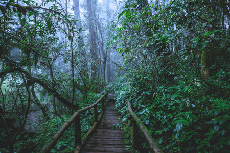 Trees and forests In the range Rain forest Green moss and wooden bridge at Angka nature trail in Doi Inthanon national park in Thailand.