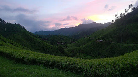 majestic sunset over mountains, with tea plantation in the background, created with generative ai
